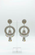 Design: The design features a large circular hoop with a smaller, bell-shaped drop (jhumka) hanging inside, adorned with multi-colored beads.