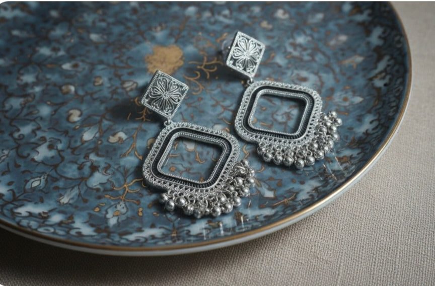 The product appears to be a pair of silver-toned square jhumka earrings with black enamel accents and small dangling beads. A potential description might highlight: