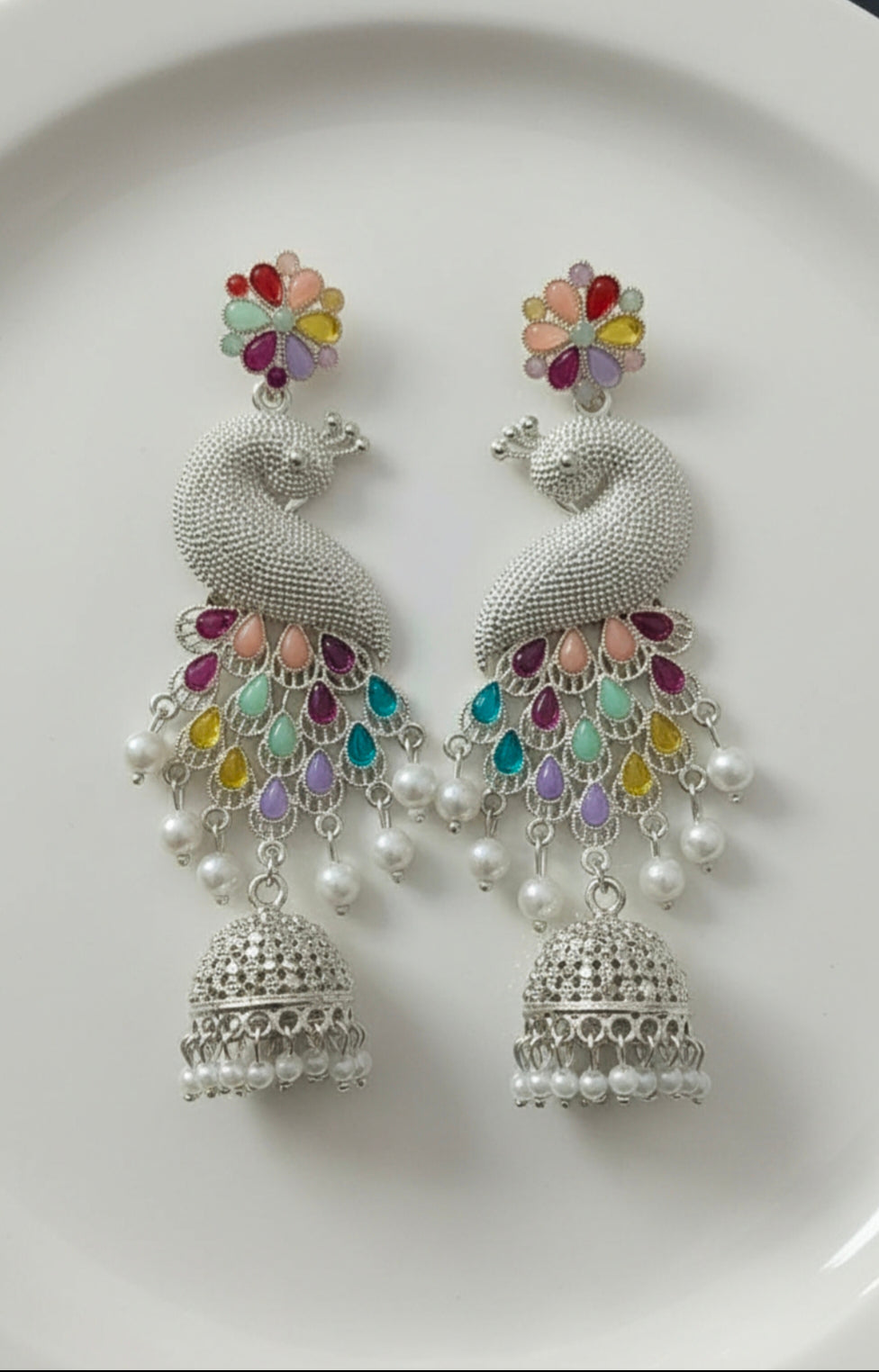 Sliver-toned, peacock -design jumka earrings by the brand StyleHub